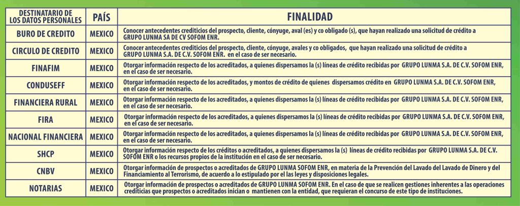 GRUPO LUNMA SA DE CV SOFOM ENR. con domicilio en Díaz Mirón #325 colonia centro TEZIUTLÁN, PUEBLA, es el responsable del uso y protección de sus datos personales y al respecto le informamos lo siguiente: